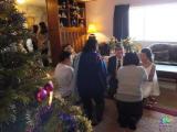 พิธีต่อด้วยผูกข้อมือ (32-35) ทั้งพ่อแม่ ญาติ ผู้ใหญ่ เพื่อนๆ จนครบ ขออภัยที่ไม่ได้ลงภาพทั้งหมดเพราะจะเยอะมากไป เลือกมาพอเป็นภาพเล่าเรื่องให้นึกออก ก่อนส่งตัว ก็ลุ้นให้หอมแก้มกัน ตามที่ทุกคนอยากเห็น ก่อนส่งตัวบ่าวสาวเข้าห้องหอ (37) บ่าวสาวก็ชื่นบานผ่านไปด้วยดีครบตามที่ตั้งใจกันไว้ แล้วก็อยู่รับประทานอาหารกัน และช่วยงานจนเสร็จค่ำมืด หน้าบ้านข้างบ้าน ก็ตกแต่งไฟเล่าเรื่องคริสต์มาสกันหลายบ้าน (38) คุณอุทิศก็ขับรถไปส่งเราที่บ้าน ที่อยู่ห่างไปราวสองกิโลเมตร ข้างนอกค่ำๆ หนาวมากราว 5 องศาซี ถ้าเดินกลับแย่แน่เลย ขอให้มีความสุขในชีวิตแต่งงานนะครับ