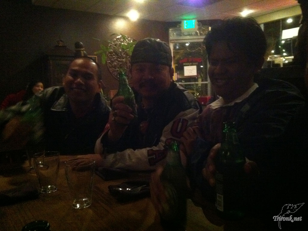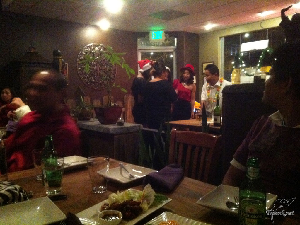 คืนวันคริสต์มาส พี่ๆ หลายคน ชวนเรามาร้านอาหาร เบิร์ด แอนด์ บี(15) ที่เมืองซูซาน เมืองติดกับแฟร์ฟิวด์ วันนี้เปลี่ยนจากร้านอาหารไทย มาเป็นผับ เพื่อฉลองคริสต์มาส บรรยากาศผับมืดๆ (16-18) ดูเหมือนบาร์ฝรั่งในเวียงจันทร์ วันนี้อนุญาตเฉพาะคนไทยและลาวมาฉลอง ยกเว้นคนในครอบครัวไทยและลาวที่เป็นฝรั่ง จึงมีแต่เพลงลูกทุ่งไทยเก่าๆ และเพลงลาว และดีเจก็เป็นภาษาลาว มีเบียร์สิงห์ เบียร์ลาว และไฮเนเก้น ให้เลือก ซึ่งเป็นเบียร์ที่นิยมในเวียงจันทร์ อาหารกับแกล้ม เหมือนอาหารอิสานบ้านเฮา เช่นเนื้อย่าง หมูย่าง จิ้มแจ่ว (19-20) บริกรก็เป็นคนลาว (ไทยอิสาน/คนลาว) แต่งเป็นซานตี้ (ซานตาครอสหญิง) น่ารักมาก (21) แล้วเวลาเต้น ก็เป็นจังหวะ บาร์สโลป (22) จังหวะยอดฮิดมาแต่โบราณกาลของลาว รู้สึกผ่อนคลายสบายใจเหมือนอยู่บ้านเราเลย