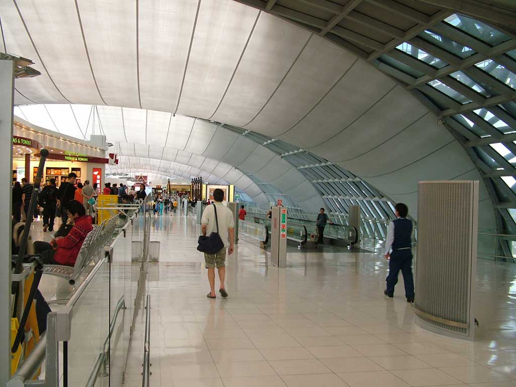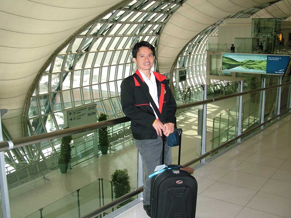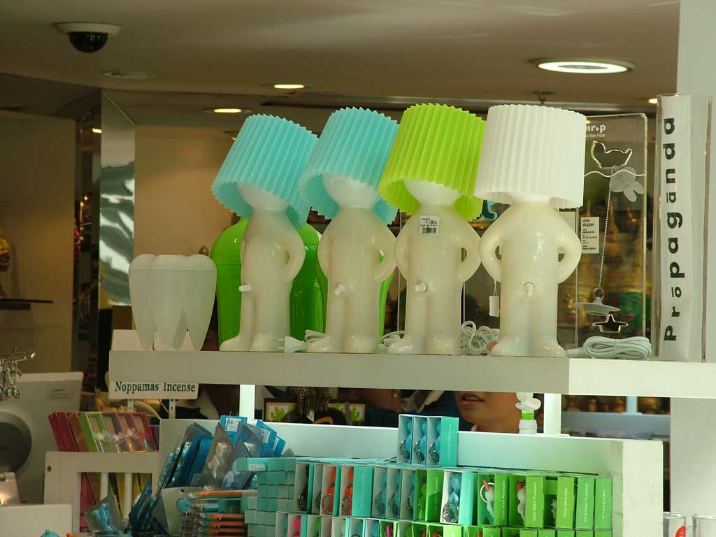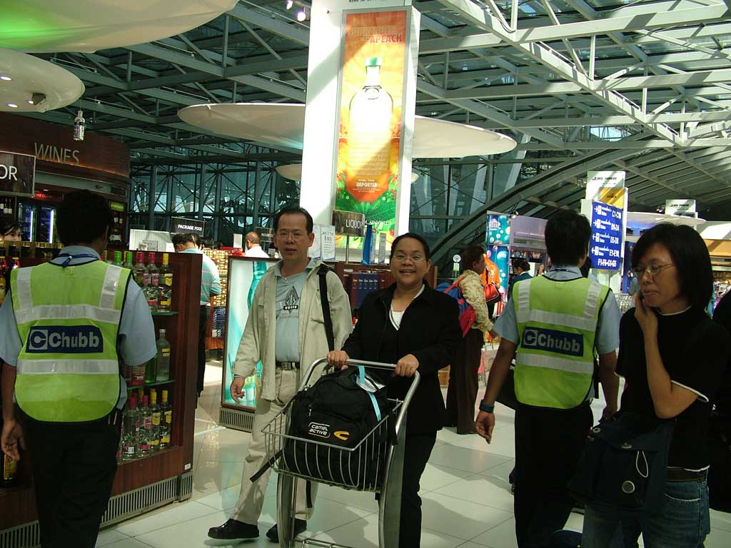 เรามีเวลาประมาณ ชั่วโมงกว่า ที่จะเดินดูร้านรวงในร้านค้าปลอดภาษี หลายท่านเริ่มชอปปิ้งกันแล้ว เช่นน้ำหอม เหล้านอก แต่ส่วนมากแค่เดินดู มันเป็นเหมือนห้างสรรพสินค้าใหญ่ๆ และราคาแพงสำหรับพวกเรา สินค้าหลายอย่าง มีแต่ที่ไทย เช่น โคมไฟเด็กชาย (1) นี่จดลิขสิทธิ์ด้วยนะครับ น่ารักอย่างไร ลองคลิกดูการเปิดปิดไฟ หรือเครื่องดีบุกลวดลายประณีต(2) บางชิ้นแพงกว่าเครื่องเงินเสียอีก มุมแรกๆ ที่ไปเจอ (3) โอ่โถงน่าเดิน ขวามือเป็นร้านกาแฟ มีของว่างให้นั่งรับประทานด้วย แต่เห็นราคาก็หยุดกึก ขนมปังราดครีมตกแต่งสวยๆ มี 3 ชิ้นเล็กๆ ราคา 600 บาท รอสักครู่ไปกินบนเครื่องบินดีกว่า เพื่อนๆ หลายท่าน(4) ก็ดูเฉยๆ