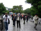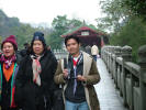 มีเก๋งจีนประดับอยู่ริมผา (21) มองไปไกลๆ เป็นสะพานข้ามน้ำ (22) เลยเชิญพี่อุทัยมาเป็นนายแบบหน่อย (23) ฟากซ้ายมือก็มี เก๋งจีนอยู่ยอดเขา (24-25) โหว, กว่าจะไปร่ำสุราชมวิวข้างบนนี่ต้องแข็งแรงน่าดู แต่ก็ขออภัยไว้ก่อน ไม่ทราบจริงๆ ว่าเป็นศาสนสถานหรือที่พักผ่อน ดูไม่ออก ปลายสะพานเป็นหินสลักชื่อสะพาน เทียนจู้ ซึ่งเป็นชื่อเดิม (26-27) คุณหมาบอกว่าสะพานนี้อายุกว่าพันปีแล้ว (ก่อนสุโขทัยราว 500 ปี) บูรณะหลายครั้ง สองข้างลำน้ำยังคงสวยงามด้วยธรรมชาติอยู่ (28-30) เราเดินไปถ่ายรูปกันเลยครับ ทางลงเป็นบันไดหินก่อด้วยซีเมนต์ มีสะพานไม้ข้าม 31-36) พี่จิ๋วได้คิวถ่ายเป็นคนแรก (37) แล้วเรากรูกันเข้ากล้อง (38-39) ทันไดนั้น เจ้าถิ่นก็มาจัดแถว ล้งเล้งๆ เราก็ฟังไม่รู้เรื่อง ผมบอกว่า โนๆ แล้วรีบถ่ายมาได้แค่นี้ แล้วเรียกพวกเราออกมาถ่ายอีกมุม (40) ก็ที่ของเขา ต้องเข้าใจ แต่ถ้าเราไม่ใช้บริการเขาก็เพียงทำท่าโมโห ถ้าเราให้เขาจัดแถวถ่ายรูปก็คิดเงินแพงๆ ทันที ผมถ่ายรูปได้อีก 4 มุมใกล้ๆ กัน (41-44) ไปต่อกันดีกว่าครับ ยังมีที่สวยๆ อีกข้างบน