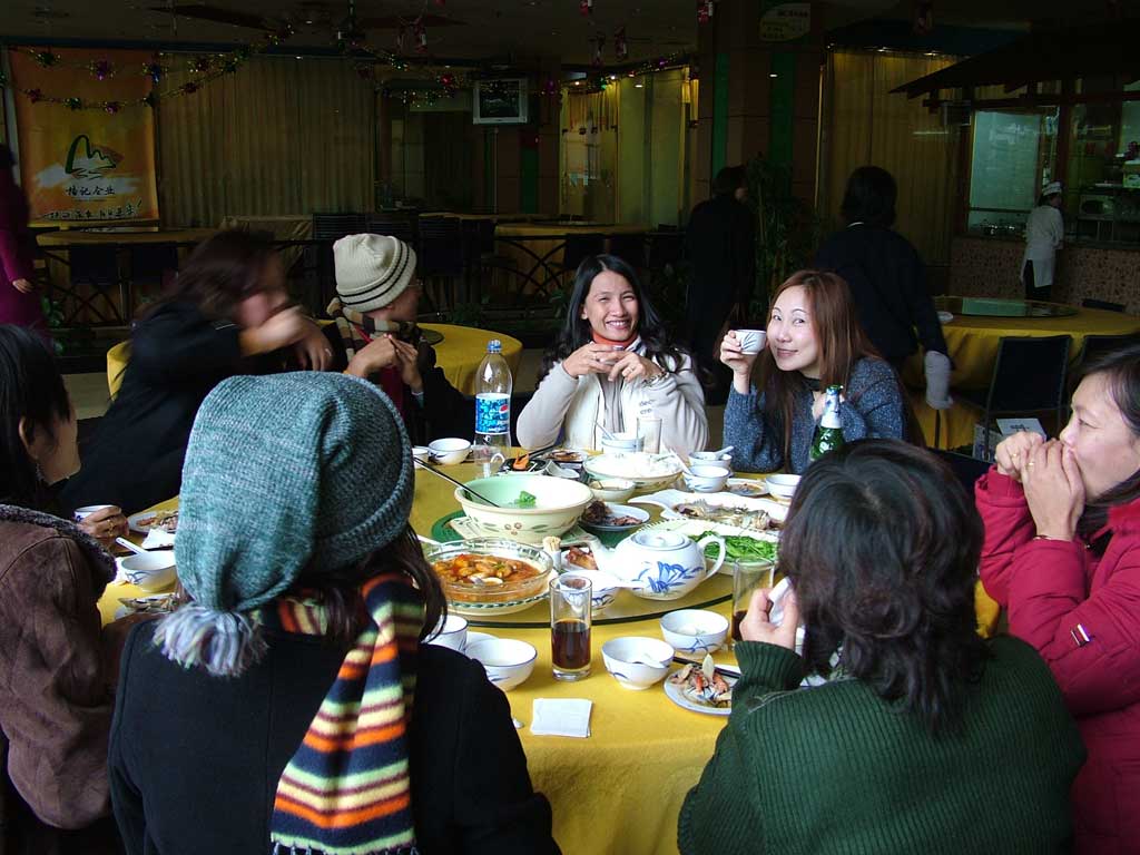 เรากลับเข้าเมือง(1-3) มารับประทานอาหารค่อนข้างตรงเวลา คือเริ่มรับประทานอาหารตอนเที่ยงวัน (4-6) อย่างมีความสุข เพราะหลายคนได้ผ้าห่มใยผ้าไหมสมปรารถนาแล้ว กำลังหิวพอดี อาหารมื้อนี้เริ่มรสชาติจัดจ้านขึ้น พี่จิ๋ว(4) บอกว่าน่าจะเป็นอาหารฮกเกี้ยน (จำไม่ผิดใช่ไหม) ซึ่งชอบอาหารเผ็ดเค็ม และการปรุงอาหารที่พิถีพิถันขึ้น บางทีอาจเพราะเราเริ่มคุ้นเคย เริ่มพึ่งพาน้ำพริกสวรรค์ของไกด์น้อยลง