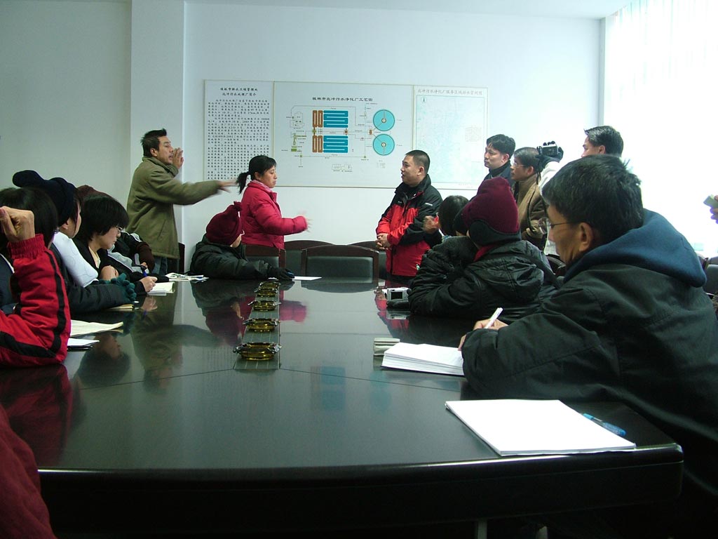 ราว 9.00 น. เราเริ่มมาถึงโรงงานบำบัดน้ำเสีย Guilinshi Wu Shui Shu Li Chang ชื่อยาวดี แต่ไม่เข้าใจว่าทำไมไม่เขียนว่า Lijiang บางทีจะเป็นคำเฉพาะ(13) หนาวมาก เรารีบเข้าห้องน้ำกันก่อน ยางคนก็ทยอยเข้าห้องประชุม ส่วนน้าณพ สำรวจฮวงจุ้ยก่อน (20) หน้าอาคารสำนักงาน เราเข้าไปรอในห้องประชุมสักครู่ ท่านผู้อำนวยการ ผู้หญิง เสื้อกันหนาวสีแดง ที่ยืนหัวโต๊ะ ให้เกียรติมาบรรยาย (21) และคุณวัลลพ (คุณหมา - ไกด์ท้องถิ่น คนจีน ผู้ชายที่ยืนหัวโต๊ะ) เป็นผู้แปลเป็นภาษาไทย เรารับฟังการบรรยายสรุป (22-27) ในตัวจังหวัดกุ้ยหลิน มีโรงงานบำบัดน้ำเสียอยู่ 6 โรง ใช้งานได้ 4 แห่ง(อ้าว?) ที่นี่ใหม่ที่สุด ใช้เทคโนโลยีล่าสุด(28-30) ประกอบด้วยการกรองตะกอนหยาบ(ขยะ นำไปทิ้งขยะ) กรองละเอียด (กรองทราย ดิน นำไปเป็นอิฐก่อสร้าง) ผ่านการบำบัดโดยเชื้อจุลินทรีย์ในระบบใช้ออกซิเจนปั๊มจากด้านล่างเหมือนอ่างเลี้ยงปลา ปล่อยให้ใส แล้วนำไปกวนตะกอน แยกตะกอนไปทำปุ๋ยอินทรีย์ขาย โดยมีบริษัทรับซิ้อทุกขั้นตอน แล้วใช้แสงยูวีฆ่าเชื้อเป็นอันดับสุดท้าย จากนั้นปล่อยลงแม่น้ำผ่านเขางวงช้างลงแม่น้ำหลีเจียง
