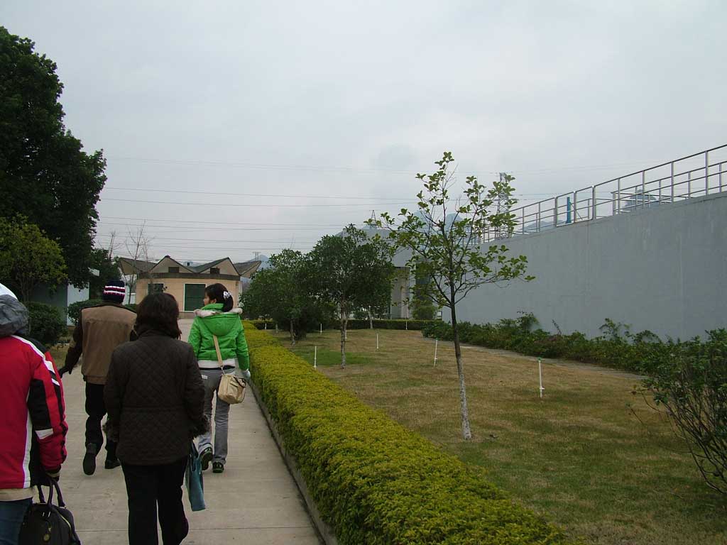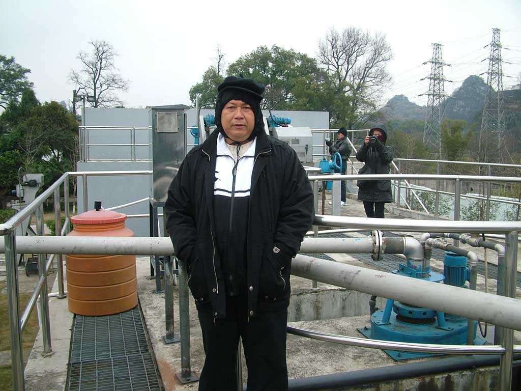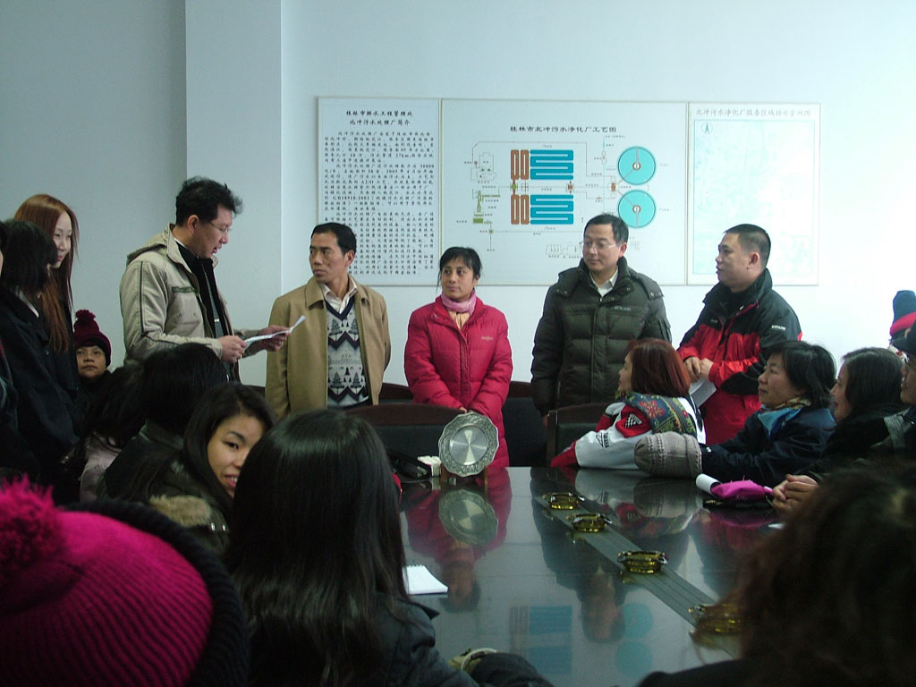 ดูงานบริเวณโรงงานมีรูปถ่ายเยอะมาก เลือกดูได้ครับ เราลงมาด้วยความหนาวเหน็บ (1) วิวสวยดี มองไปทางขวามือ เป็นรถที่เราโดยสารมากับภูเขาหินปูนที่ไกด์บอกว่า ถ้าคุณมากุ้ยหลิน มอง 360 องศา ไม่เห็นเขาหินปูน แสดงว่าคุณไม่ได้อยู่กุ้ยหลินแล้ว ทีแรกเรานึกว่าจะเป็นเจ้าหน้าที่บรรยาย คนบรรยายกลับเป็นน้องทราย (2) เธออายุเพียง 18 ปี เรียนภาษาไทยเพียงปีครึ่ง แต่ความสามารถน่าทึ่งมาก เธอคุมพวกเราได้อยู่หมัด (พูดคงไม่เกินจริง) ปกติเธออยู่บัส 2 ดูแลกลุ่ม 2 น้องทรายอธิบายกระบวนการยากๆ ของระบบบำบัดน้ำเสียได้อย่างครบถ้วน และตอบปัญหาพวกเราได้อย่างหายสงสัย เราแปลกใจว่าเธอเตรียมตัวได้ดีมาก ตามเธอไปดูดีกว่า เร็วเข้า เธอบ่นว่าหนาวมาก เพราะเราเป็นกลุ่มลำดับที่ 2 หลังจากที่เธอออกมาข้างนอกกว่าครึ่งชั่วโมงแล้ว อุณหภูมิตอนนี้ราว 2-3 องศา และลมพัดมาเป็นระยะๆ หนาวมั่กๆ ไปเร็ว เราเดินออกจากอาคารสำนักงานออกซ้ายมือ เป็นโรงงานที่กว้างเอาการ (3-5)