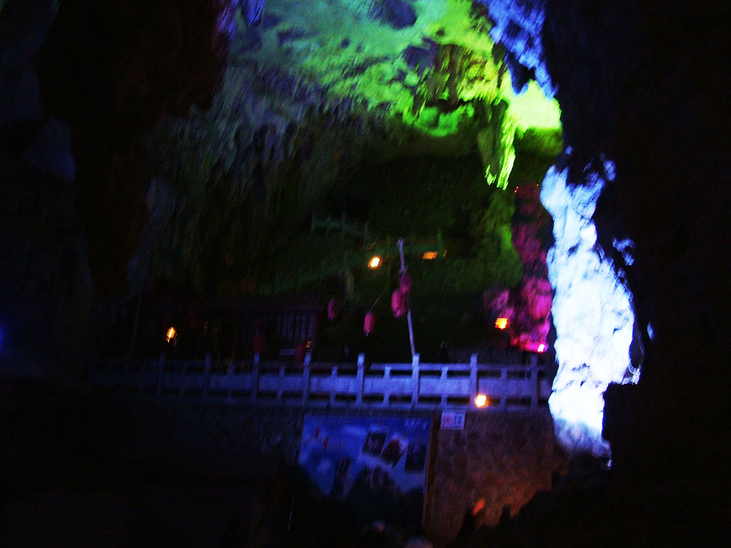 ค่ำแล้ว ดูเหมือนจะประมาณ บ่าย 5 โมงเย็นแล้ว ยังเหลืออีก 1 ทริป คือ ถ้ำเงิน เดินทางออกมาอากาศขมุกขมัว มีหมอกโปรยเหมือนฝนเม็ดเล็กๆ อากาศเย็นทำให้กระจกข้างในเป็นฝ้าหนา ปมใช้มือปาดน้ำจากกระจก เพื่อถ่ายรูปให้ท่านผู้อ่านได้ดูข้างๆ ทาง (1-12) ที่สวยงามขนาดนี้ให้ชม ภูมิภาคนี้ เต็มไปด้วยเขาหินปูน บางภาพไม่ชัดเจนจากการถ่ายรูปบนรถที่เคลื่อนไหว และแสงที่น้อย ก็ดีนคิดเสียว่าไปดูด้วยกัน ประมาณนี้แหละ คัดทิ้งไปเยอะ ช่วงนี้ เราได้ดู ภาพยนตร์ พากษ์ไทย เรื่องจอมใจบ้านมีดบิน หรือ House of Flying Daggers เป็นภาพยนตร์จีนกำลังภายในลำดับที่ 2 ของผู้กำกับนามระบือ จางอี้โหมว พล็อตเรื่องที่เรียบนิ่งแต่น่าติดตาม อีกทั้งสีสันและวิวทิวทัศน์ที่งดงามตระการตา เรื่องนี้เราดูหลายครั้งตั้งแต่เริ่มวันนี้ช่วงเช้า หลายคนต้องติดงอม ร้องขอให้ฉายให้จบ การแต่งภาพต่างๆให้ออกมาวิจิตรงดงามเกินความเป็นจริง แต่สวยดี โดยคุณหมา ได้เล่าถึงภาพยนตร์โฆษณาจังหวัด กุ้ยหลิน และเขตปกครองตนเองกวางสี ซึ่งเดิมเป็นมณฑลกวางสี ข้อแตกต่างระหว่างมณฑลคือ มณฑล นับเป็นจีน ภาคหนึ่ง ส่วน เขตปกครองตนเอง เป็นกลุ่มชุมชนหนึ่ง ไม่ต้องนำภาษีส่งรัฐบาลกลาง ผู้ปกครองสูงสุดเป็นชนกลุ่มนั้น กวางสี เป็นชุมชนของคนกลุ่มน้อย เผ่าจ้วง มีประชากรประมาณ 300 ล้านคน (มันน้อยเหรอเนี่ย? คนไทยทั้งประเทศยัง 65 ล้านคนเอง) โฆษณานี้ใช้งบประมาณนับพันล้านบาท เล่าถึงจ้วงเผ่าย่อยต่างๆ ที่มีเอกลักษณ์ และความสวยงามของสิ่งแวดล้อมทางธรรมชาติ วิถีชีวิต วัฒนธรรมและเรื่องน่าสนใจมากมาย พร้อมกับฉายหนังนี้ให้ดู สวยมากๆ น่าเสียดายที่ไม่สามารถหาซื้อมาได้ ผู้อำนวยการสร้างคือจางอี้โหมว ซี่งเป็นที่ชื้นชมในฝีมือมาก นอกจากนี้ ยังมีการแสดงกลางแจ้งในแม่น้ำหลีเจียง กำกับการแสดงโดยจางอี้โหมว ที่ใหญ่จนใช้แม่น้ำเป็นเวที ใช้ภูเขาเป็นฉาก ใช้คนกว่า 5,000 คน ในแต่ละฉาก เสียดายที่ระยะนี้งดการแสดง เนื่องจากอากาศหนาวเย็นเกินไปที่จะมีคนดู และคนแสดงไม่สามารถทนความหนาวได้เช่นกัน อดดูเลย เขาบอกว่าจริงๆ แล้ว ทัวร์เราจะได้รับชมด้วยถ้าอากาศอุ่นกว่านี้