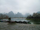 มาถึงตามธรรมเนียม ก็เข้าห้องน้ำกันก่อน(20-21) ห้องน้ำที่นี่สวยมาก ทำด้วยหินแกรนิต พื้นและผนังเป็นหินอ่อน ติดฮีตเตอร์ อบอุ่นดี (เทียบกับบ้านเราก็เหมือนห้องน้ำติดแอร์) และห้องน้ำโถปัสสาวะมีเซ็นเซอร์ ไม่ต้องเปิดน้ำเอง (เทียบกับบ้านเราเหมือนโรงแรมหรู หรือศูนย์การค้าสมัยใหม่) และไม่เก็บเงิน แม้คนมาใช้บริหารเยอะ แต่ก็ดูสะอาด มีแม่บ้านคอยดูแลตลอด เรามีเวลาสิบนาทีเข้าห้องน้ำ ให้ดูข้างนอกก้อพอ ข้างในมีนักท่องเที่ยวเยอะ เดี๋ยวจะหาว่าตาคนนี้โรคจิต แล้วก็ออกมารอ ตรงนี้เป็นลานที่พวกเรารวมพลกันเพื่อรอเรือนั่งไปชมหมู่บ้าน (22-23) เราจะไปทางเรือกัน ช่วงรอเรามาดูบรรยากาศรอบๆ กัน ตรงนี้เป็นสะพานครับ (24) เรียกกันว่าสะพานแบบจ้วง ชื่อสะพานแห่งลมและสายฝน สะพานนี้เป็นเอกลักษณ์ที่โดดเด่น คือเป็นสะพานไม้ มีหลังคาทรงจีน มีที่นั่งข้างทางเพื่อให้ผู้สูงอายุได้นั่งพักได้ตลอดทาง (25) ถ้าเราดูจากข้างหน้า(26) เหมือนอาคารธรรมดา แต่นัยว่าลงทุนมาก ใช้สถาปัตยกรรมที่ซับซ้อน โครงสร้างที่แข็งแรงและสวยงามกว่าบ้านทั่วไป(27-29) เนื่องจากสร้างข้ามแม่น้ำ หลังใหญ่โตและทอดยาว และยังมีจัดการพื้นที่ใช้สอยบนสะพานมากกว่าสะพานทั่วไป ทราบว่า สะพานนี้ สร้างมาหลายร้อยปีแล้ว และบูรณะหลายครั้ง ล่าสุดเมื่อปีที่แล้วนี่เอง ขากลับเราจะได้ชมกัน จุดนี้เราเริ่มเห็นความสวยงามของขุนเขาแล้ว (30-31) เป็นท่าจอเรือบริการทัวร์ทั้งหลาย รอบๆ มีความสวยงามของเชิงสะพาน (32-33) ผมเดินเลียบมาที่ต้นสะพานเพื่อชมความงามของหลิวลู่ลม ต้นหลิวที่ทิ้งใบเกือบหมด เป็นเสน่ห์อย่างยิ่ง ลองเปิดดูแฟ้มภาพของพี่นรินทร์ (34-35) คาดว่าจะสวยงามเอาการเพราะถ่ายไปหลายฉากเหมือนกัน ต้นหลิวกับเรื่อ (35) ได้บรรยากาศจีนๆ เหมือนในหนัง เพียงแต่นี่ไม่ใช่การจัดฉากเหมือนในหนัง แต่เป็นชีวิตจริงของคนที่นี่ แล้วก็ แม๊... ท่านผู้อ่านครับ นึกว่าตู้ยาม ปลาดุก เอ๊ย! ปรากฏว่าเป็นตู้โทรศัพท์ ก็เมื่อแม่นางคนงามยกหูโทรศัพท์มาหนีห่าว (คิดไปเอง น่าจะพูดอย่างนี้มั้ง) แหมๆ น่ารักทั้งสาวจีน น่ารักทั้งตู้โทรศัพท์เลย