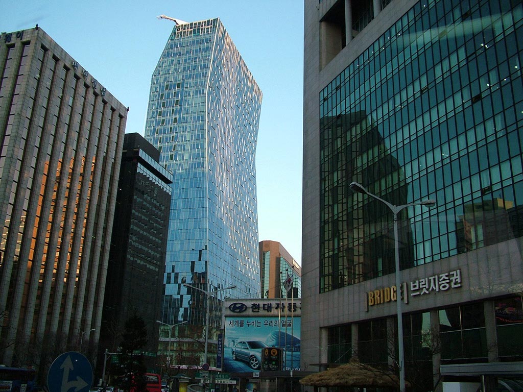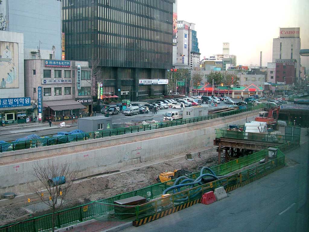 เดินทางผ่านเมืองมาอีกฟาก แม่น้ำ ผ่านสนามกีฬาโอลิมปิคด้วย (รูปที่ 19) รูปนี้ถ่ายจากรถ ตั้งหลายรูป ชอบรูปนี้แหละ และก็มีรูปตึกระฟ้า(รูปที่ 19) อันที่จริงเป็นตึกชื่อดัง แต่ไม่มีโอกาสถามชื่อ มาถึงที่ดูงานแหล่งที่ 3 ค่อนข้างมืดแล้ว เวลาสี่โมงกว่า เรียกว่า Cheonggyecheon Restoration เป็นที่ลงทุนหนัก ทุบทางด่วนยกระดับ ซึ่งใช้การได้ดีอยู่ เพื่อคืนลำน้ำกลางเมือง ให้ไหลดีเหมือนเดิม เนื่องจากมีปัญหาน้ำเสีย เราดูโมเดล (รูปที่ 21) ก่อน และมีการบรรยายประกอบรูปโครงการ ต้นโครงการจะเป็นศูนย์การค้าใต้ดิน มีรถไฟฟ้าผ่าน มีน้ำตกสวยๆ ซึ่งสูบน้ำผ่านท่อข้างๆ โครงการมาจากทะเลสาบปลายแม่น้ำ (รูปที่ 23) แล้วผ่านการบำบัดแบบโครงการก่อน ทำสาวนสาธารณะแคบๆ ข้างๆ สายน้ำด้วย เพื่อเป็นที่พักผ่อน หรือสวนสาธารณะด้วย มีทั้งที่ออกกำลังกาย น้ำตก น้ำพุ ที่จ๊อกกิ้ง สวนดอกไม้ ฯลฯตอนนี้เริ่มโครงการแล้ว (รูปที่ 24-25 ถ่ายจากหน้าต่าง และ) เป็นโครงการที่ใช้เงินสูงมาก เห็นบอกว่าเป็นโครงการร้อยปีม้าง... คงพูดแล่น แต่ก็ประมาณนั้น ก่อนออกมา ก็มีห้องแสดงความก้าวหน้า เป็นภาพโดยรวมโครงการ (รูปที่ 23) และภาพถ่ายแสดงเป็นรายสัปดาห์ใน 1 ปี (รูปที่ 24)