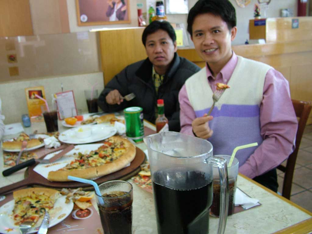 หลังจากฮุนไดรถยนต์ ไปดูฮุนไดอุตสาหกรรมหนัก เป็นโรงงานผลิตของที่ใหญ่ๆ หนักๆ มากๆ เช่น เรือเดินสมุทรใหญ่ๆ 3-4 ร้อยเมตร หรือปั้นจั่นยักษ์ ดาวเทียม ฐานปล่อยจรวด ฐานขุดเจาะน้ำมัน ฯลฯ ยิ่งใหญ่อลังการใหญ่มาก มีคนทำงานที่นี่นับล้านคน แต่ไม่อนุญาตให้ถ่ายรูปเช่นกัน เมืองนี้ว่ากันว่า 80% ขึ้นไปของเมือง เต็มไปด้วยกิจการของฮุนได จนคนเกาหลี เรียกเมืองนี้ว่าสาธารณรัฐฮุนได ที่นี่ได้ของที่ระลึกเหมือนกัน เป็นชุดไขควงเครื่องมือเล็กๆ หิวข้าวละ ดูกันเต็มที่แล้ว ผู้ประสานงานโครงการพาไปทาน พิซซ่า ฮัท กัน เธอบอกว่าเป็นร้านพิซซ่าที่อร่อยที่สุดในโลก (รูปที่ 1) ปรากฏว่า ทานได้คนละชิ้น พากันทาน สลัดกันซะให้อิ่ม เพราะออกจะเลี่ยน ไม่ค่อยเหมือนบ้านเราเลย มีแต่เวียดนาม ทานตั้งคนละ 5 ชิ้นได้ไงไม่รู้ เหลือบานเลย ต้องห่อกลับ เสียดาย เมืองเขาน่าอยู่ ออกมาเดินย่อยอาหารเลยถ่ายรูปมาให้ดูด้วย (รูปที่ 2) เราแวะชอปปิ้งกันที่คาร์ฟู ดีจังเลยได้ลูกอมโสมราคาไม่แพงมากมา 3 ถุง จะได้ฝากเพื่อนๆ ขณะที่เพื่อนซื้อแพงกว่า คือบุน-ซัง ซื้อแพงกว่า 4 เท่า และฟิลิปปินส์ แพงกว่า 8 เท่า โวยวายกันใหญ่