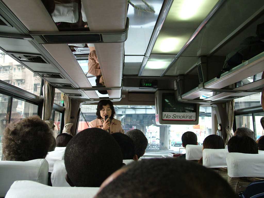 เราไปรอไก้ด์ ที่โรงแรมกลางเมืองเกียวโต (รูปที่ 3) เพื่อรอกลุ่มด้วย กลุ่มเราเป็นพวกที่ได้รับทุนไจก้า สาขาโตเกียว จากประเทศทางยุโรป และกลุ่มผิวดำ มาทัวร์รวมกัน อิซูกะ-ซัง ก็ไปพักผ่อน มอบหน้าที่ให้ไก้ด์ เธอบอกว่า อาจจะหลงได้ จำหน้าสวยๆ เธอไว้ให้ดี อาจจะจำยากหน่อย(รูปที่ 4) ผมว่า หน้าอย่างนี้ จำได้ง่ายมาก เรานั่งรถทัวร์ ไปจุดต่างๆ ในเมือง พอลงที่แรก ก็บอกว่า ตามธงเธอไป(รูปที่ 5) เพราะบางทีอยู่ในกลุ่มอาจมองไม่เห็นเธอ ธงของไก้ด์นี่เขาดีไซน์น่ารักดี ต่างๆ กันไปแต่ละกลุ่ม