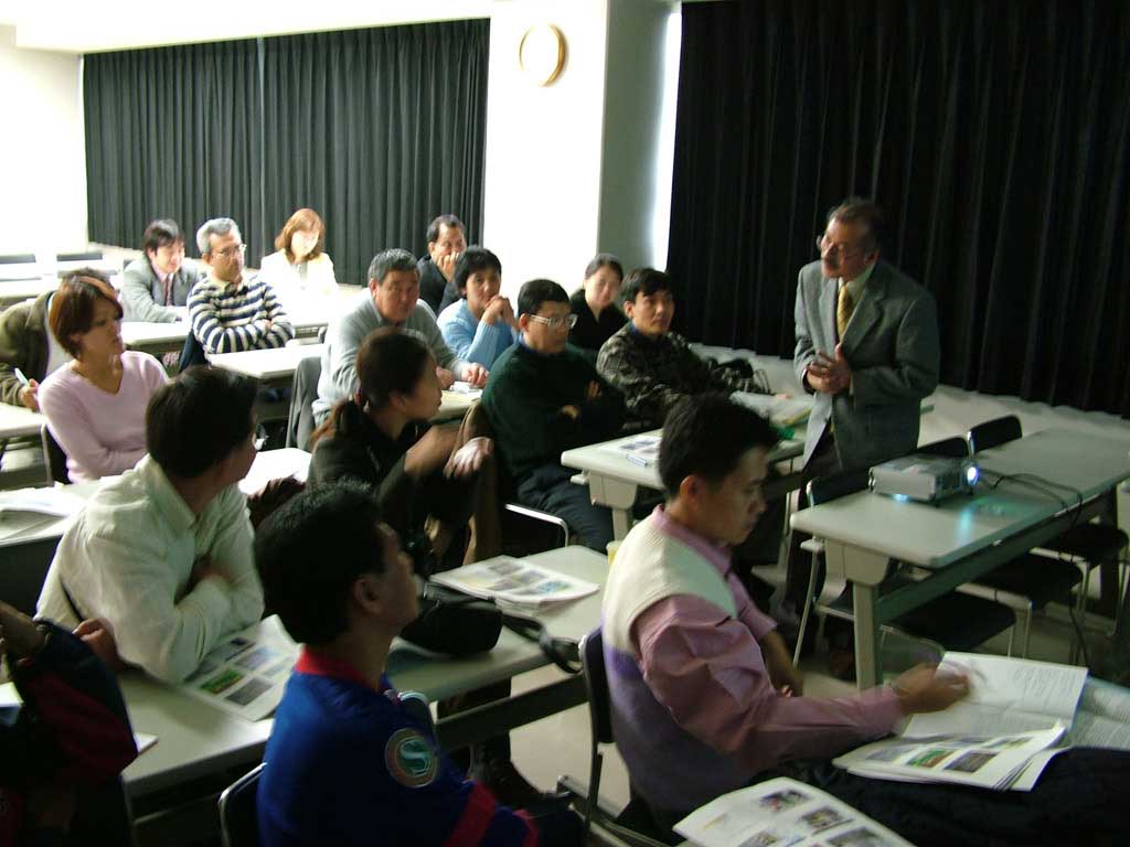 กินข้าวกันแบบบุฟเฟ่ต์ของโรงแรม มีบัตรอาหารเช้า กินอาหารเช้าแบบญี่ปุ่น เป็นข้าวกับซุป ปลาดิบ ของทอด อะไรพวกนี้ ชอบภาพนี้มาก แสงเงาและบรรยากาศดูอบอุ่นดี (รูปที่ 1) อากาศข้างนอกเย็น แต่ยังไม่ถึงเวลาออกไปเรียน เลยมีเวลาออกมาดูน้องๆ ไปโรงเรียนกัน ถึงจะเย็นมาก (บ้านเราเรียกว่าหนาวจัด) แต่ก็นิยมใส่กันอย่างนี้ (รูปที่ 2) ดูเธอสนุกสนานกันดีแม้อากาศจะหนาวมาก รูปนี้จะว่าแอบถ่ายก็ได้ เพราะซูมภาพจากที่ไกลๆ ให้ดูรูปเดียวนะครับ ที่เหลือขอดูเอง อิอิ อ้าว แหม! วันหลังจะให้ดูเพิ่มอีก รับปาก ก็... จากนั้น ผมก็เดินดูใกล้ๆ โรงแรม ที่นี่เขาจัดการแสดงรูปปั้น เป็นระยะๆ (รูปที่ 3) อย่างรูปนี้ ไม่รู้ใครปั้น เพราะไม่รู้ไปถามใคร แต่ก็น่ารักดี เหมือนอนุสาวรีย์ แต่ใกล้ชิดถึงผลงานดี ลูบคลำได้ และไม่ใหญ่โตมาก ถ่ายรูปนิดหน่อยก็หนาวมาก ก็ไปหิ้วกระเป๋าออกมาเช็คเอ้าท์ เดินทางด้วยรถของไจก้า ไปมหาวิทยาลัยเทคโนโยลีนากาโอกะ เป็นมหาวิทยาลัยที่ตั้งบนลูกคลื่นลอนลาด (ภูเขาที่เป็นเนินไม่สูงมาก) มองลงไปเห็นหมู่บ้าน เมืองนากาโอกะ ข่างล่าง (รูปที่ 4) แล้วเราก็พากันลงรถ ให้ดูรถครับ(รูปที่ 5) คันใหญ่ๆ ก็ดี อาจารย์ก็มาพร้อมกันเลย ที่นี่กว้างดี อาคารส่วนใหญ่เป็นแบบยุโรป เพื่อประโยชน์ใช้สอยได้เยอะ(รูปที่ 6-7)อาจารย์ ฮาราดะ สอนเช้านี้ (รูปที่ 8) เป็นดอกเตอร์ด้านวิศวกรรมสิ่งแวดล้อม ที่เป็นที่ยอมรับนับถือมาก บรรยายเรื่อง Anaerobic Treatment of Sewage and oversea operation และวิธีบำบัดน้ำเสียของหลายๆ ประเทศมาเทียบกัน การทำให้ได้น้ำที่สะอาดกว่าวิธีอื่นอีกหลายวิธี เช่น การใช้ฟองน้ำธรรมดาที่ใช้กันทั่วไป มาบำบัดน้ำเสีย บรรยากาศในห้องเรียนเป็นอย่างนี้ (รูปที่ 9) อาจารย์เดินคุยกับทุกคนไปทั่วห้อง ต้องหมุนเก้าอี้ไปมาจนเมื่อยคอ วันนี้เป็นวันดีอีกวันที่มีเบรคกาแฟ ซึ่งนับเป็นวันพิเศษ ปกติเขาไม่มีกัน ดูสีหน้า เต๋า-ซัง จากเวียดนาม มีความสุขที่ได้จิบกาแฟ หลังเบรค