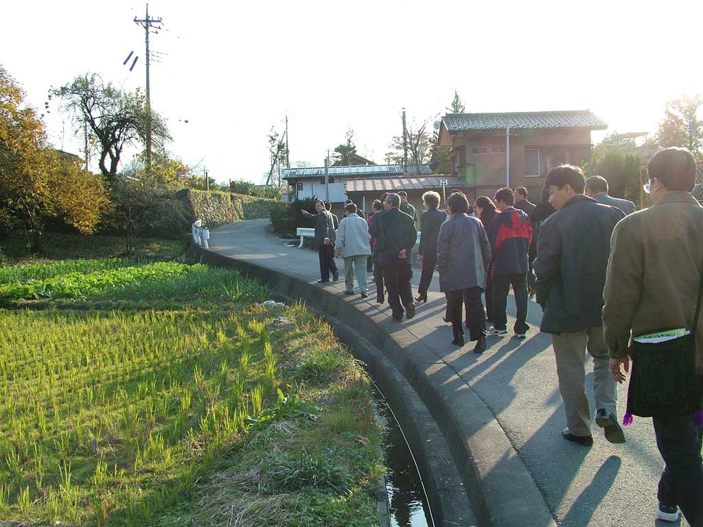 เลยบ้านคุณฮาชิโมโต้ เราเดินมาส่งอาจารย์และกลับรถ มีการตาก persimmon เป็นผลไม้พวกพลับ เขาปอกเปลือก แล้วตากแห้งเอาไว้ทานกับข้าวต้ม ไต่ไม้รู้ต้องผ่านกระบวนการอะไรบ้าง และเนื่องจากอากาศหนาว การปลูกดอกไม้ไม่ค่อยงอกงาม บางบ้านก็ลูกลูกไม้สีสวยๆ อย่างนี้แทน (รูปที่ 26) นี่เป็นลูกไม้สีแดง ขนาดราวนิ้วก้อย สวยเหมือนดอกไม้เลย และเขาก็มีการปลูกข้าวตามที่ค่อนข้างราบ เพราะมีน้ำค่อนข้างเยอะ (รูปที่ 27)