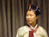 บ่ายนี้ เรียนวัฒนธรรมเกาหลี เริ่มจากวิดิโอเต้นรำแบบเกาหลี และเชิญโตโต้-ซัง (คนซ้ายมือ รูปที่ 12) เต๋า-ซัง (คนกลาง) อาจารย์แต่งตัวแบบเกาหลีให้ มีหมวกยอดนิยม 2 แบบ เป็นที่น่าครื้นเครง ของเต๋า-ซัง (รูปที่ 13) คนต่อมา คือ จาง-ซัง คนจีน เธออาสาขึ้นไป (รูปที่ 14-15) แหม๊! เหมือนสาวเกาหลี มักๆ เลย แล้วก็เล่าเรื่องธงชาติ เรื่องของการ์ด (ไพ่เกาหลี) ที่มีรูปแปลกๆ เฉพาะ จากนั้นก็แจกเงิน บอกกฎระเบียบต่างๆ ฉายสไลด์แนะนำสถานที่ท่องเที่ยว ตลาดต่างๆ การเดินทางทางรถไฟใต้ดิน รถยนต์ แจกเงินได้คนละ 3 แสนกว่าวอน ประมาณ 12,000 บาท คือ 306 $us น้อยกว่าไจก้า (400+ $us ประมาณ 68,000 เยน) เพราะที่นี่ฟรีทุกมื้อ ไม่ต้องไปซื้อเอง มีของแจกเยอะด้วย เช่าน กระเป๋าหนัง ของที่ระลึก เอกสารต่างๆ รวมทั้งบัตรรถเมย์มูลค่า 10,000 วอน