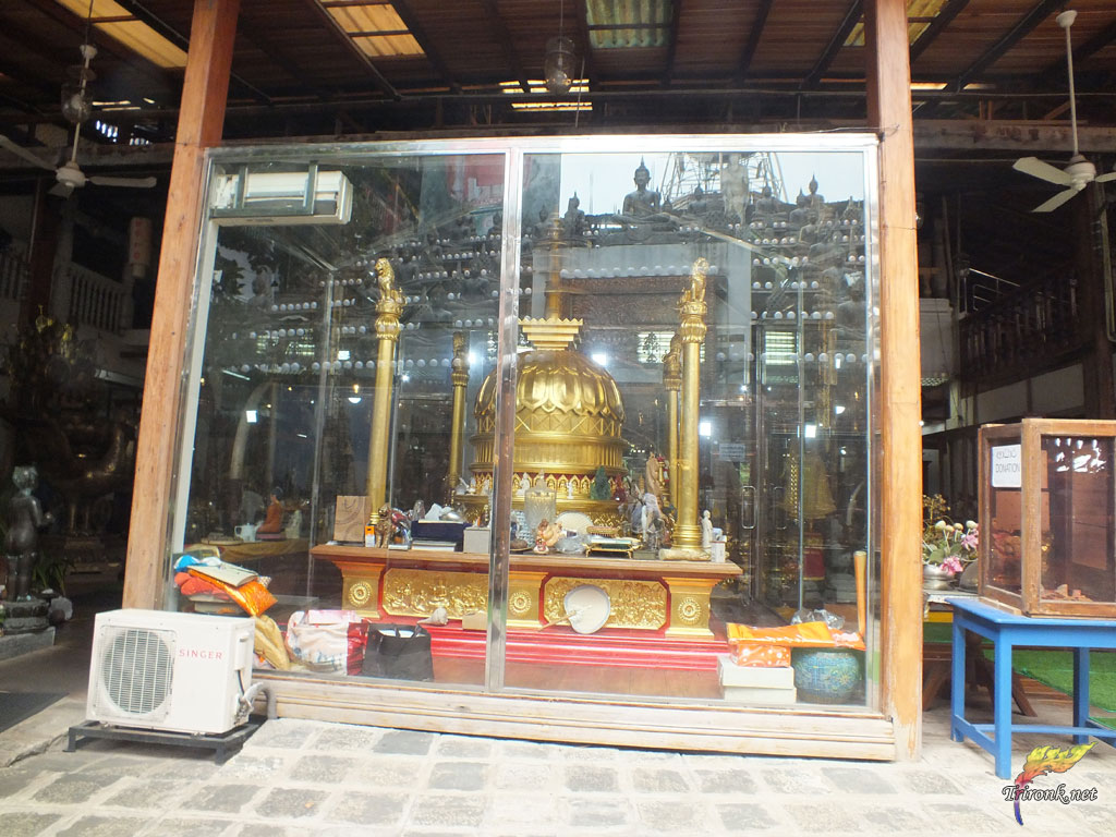 สิ่งแรกที่ได้เจอคือ ขุมทรัพย์เลย (27) ชาวบ้านิยมบริจาคของมีค่า เช่นเครื่องประดับ ให้วัด ยิ่งนานวันยิ่งมาก วัดก็ใส่จานใส่ถาดมากมายหลายตู้เต็มไปหมด ดูเป็นของมีค่าของโจรสลัดในนิยาย มันมากจนสุมๆๆ กันราวของไม่มีค่า แต่มันคือเพชรนิลจินดา โลหะส่วนใหญ่เป็นเงิน เป็นที่นิยมเพราะสวยงามและราคาถูกกว่าทองคำ ของพวกนี้ถูกเก็บไว้ในตู้กระจก (28) เยอะมาก กันฝุ่นผงได้อีกระดับ และยังชื่นชมได้โดยง่ายและปลอดภัย เราตรงไปกราบพระแก้วมรกตจำลอง (29) ทรงชุดหน้าร้อน ไกด์บอกว่ามาจากเป็นมรกตแท้จากประเทศไทย เข้าใจว่าราชวงศ์ไทยระดับสูงถวายให้วัด เขาไม่รู้มากนักเพราะไม่มีป้ายอธิบาย และตรงหน้าเป็นคริสตัลมีค่าสูงขนาดสูงกว่า 1 ฟุต ถวายเป็นพุทธบูชาและเครื่องบูชาพระแก้วมรกต โดยมหาเศรษฐีเจ้าของธนาคารใหญ่ของศรีลังกา เพื่ออุทิศให้คุณอเล็กซ์ (30) บุตรชายของท่าน ยังมีรูป และสักกระด้วยพวงมาลัยมะลิสด