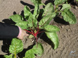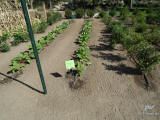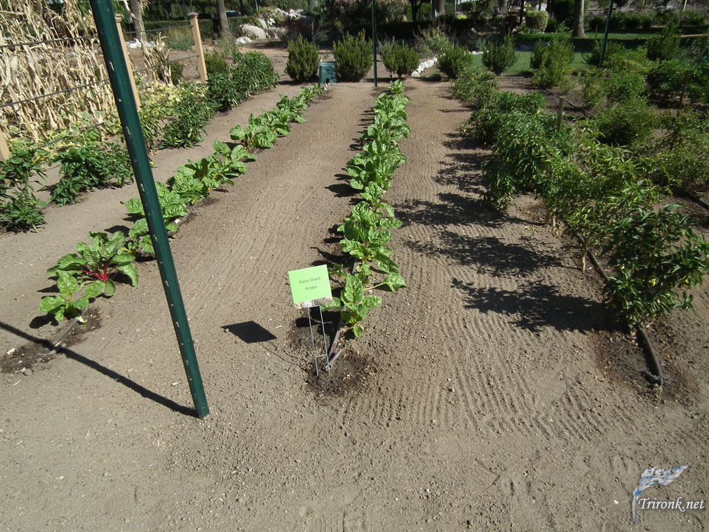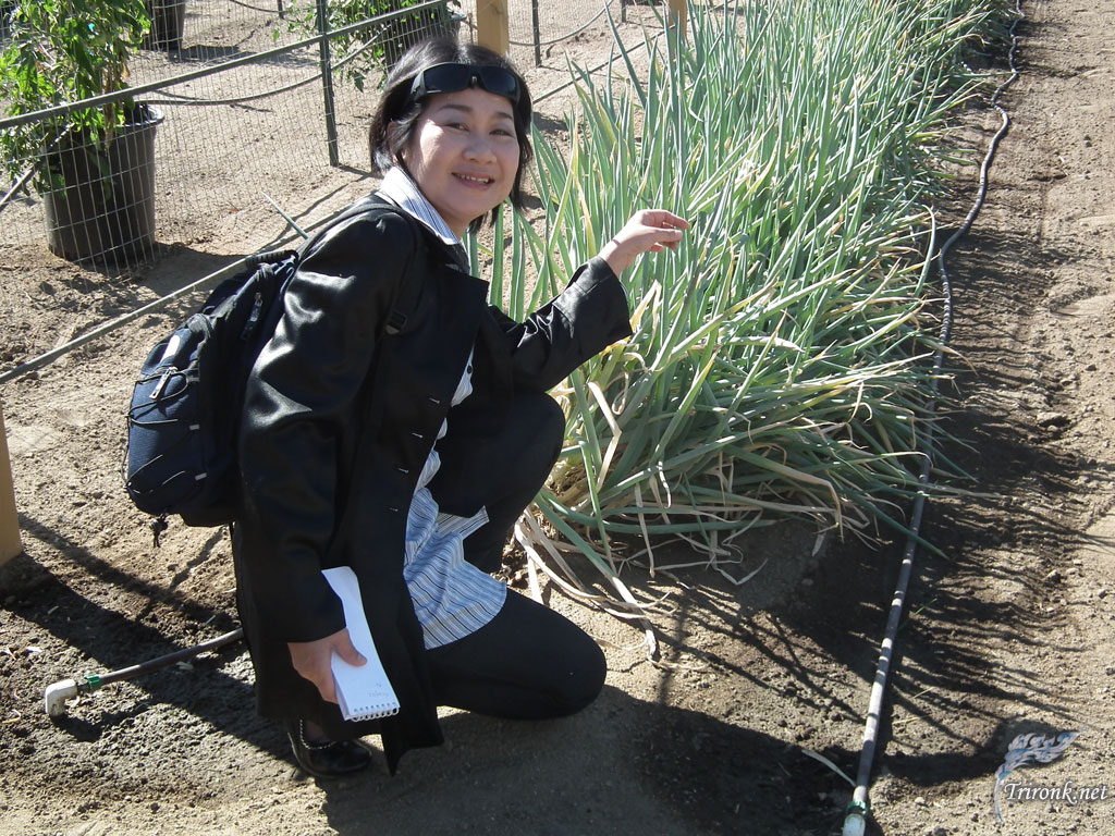 มันเทศป่า(27) ที่ใช้คงรูปให้วิตามินซีเสถียร ต้นหอมใบโตๆ (28) กับคุณนา ดูสมบูรณ์จริงๆ ผมแปลกใจทีดูแห้ง ดูแล้ง แต่เพราะดินดี แดดดี และความชี้ได้จากระบบน้ำหยด น้ำจึงพอดีตลอด ไม่สูญเสียไปกับบริเวณที่ไม่ต้องการความชุ่มชื้น แปลงผักโขมสวิส (Swiss Chard) หรือบ้านเราเรียวกว่า บีทรูธ พืชหัวสีแดงๆ (29-31) จะเห็นว่าเขาหยดน้ำจากท่อ ใกล้ๆ ต้นเลย ชุ่มตลอด และดินก็เต็มไปด้วยปุ๋ย มีต้น ซูกินี่ (Zucchini) พืชตระกูลบวบ (31) ต้นเตี้ยๆ ดอกเต็ม เราเรียกว่าแก่แดด เก่งจริงนะ ตัวแค่นี้ อีกต้น เป็น แครอท (33) เคยเห็น แต่ไม่เคยเห็นตอนอยู่ในดินอย่างนี้ นี่ยังเล็กๆ อยู่ เพิ่งปลูก